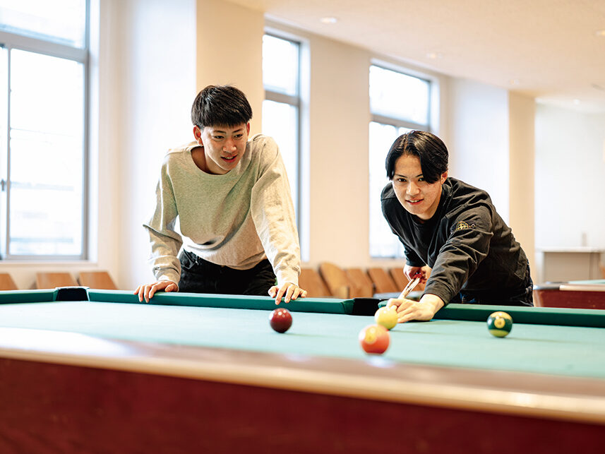 まるでホテルのような佇まいの男子寮「ケンブリッジハウス」。ゆとりあるワンルームマンションタイプの住空間はすべて個室。友人の部屋に行き来しやすい一方、プライバシーもしっかり保たれています。男子学生のお腹を満たす食堂や、ゆっくり湯船に浸かれる大浴場、ランドリーなどの館内施設のほか、周辺環境も充実し、快適な寮生活を楽しめます。留学生も多く入居し、異文化交流を深めるチャンス!
