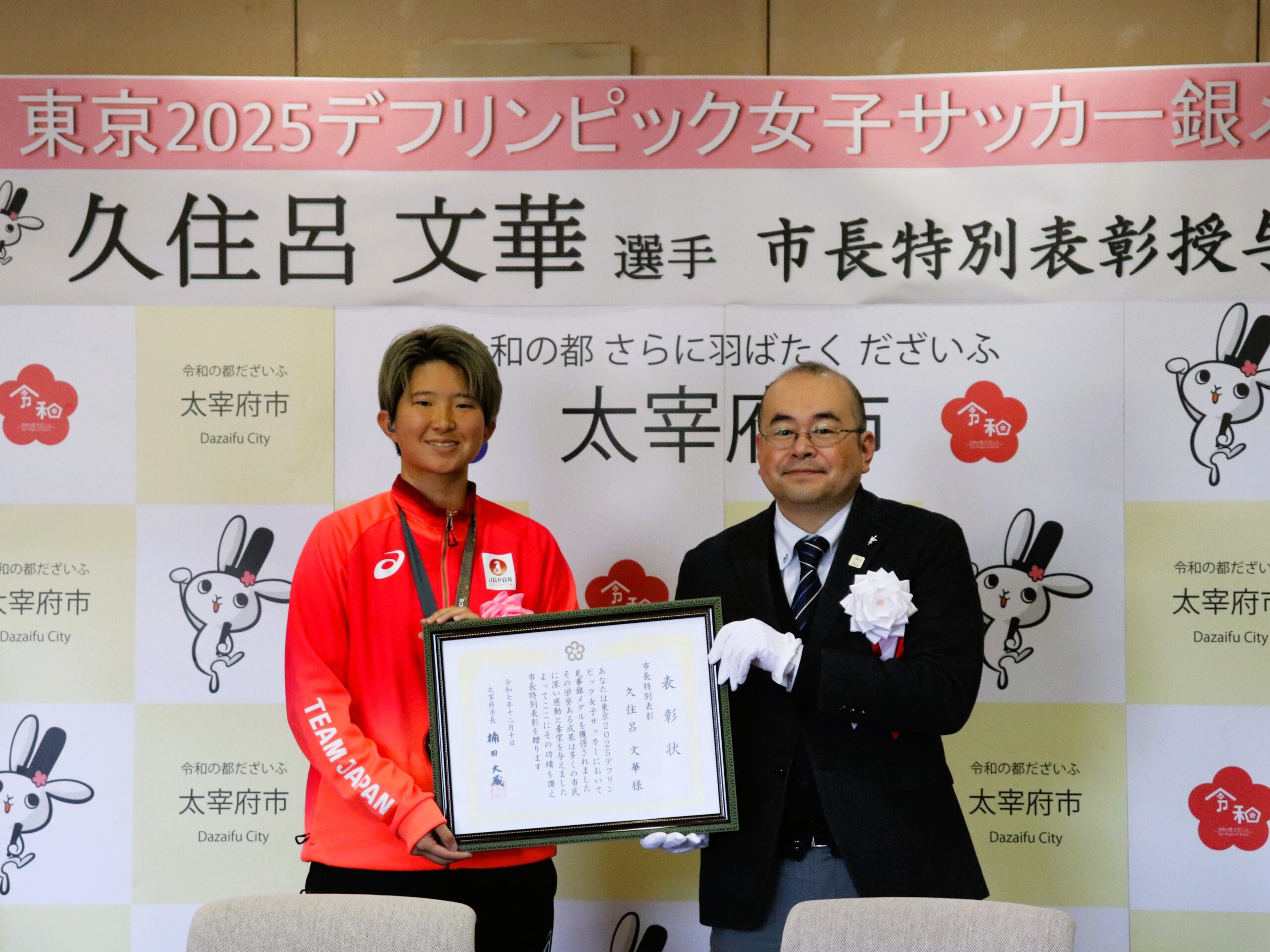 デフリンピック女子サッカー銀メダルの久住呂文華さんが太宰府市長特別表彰を受賞