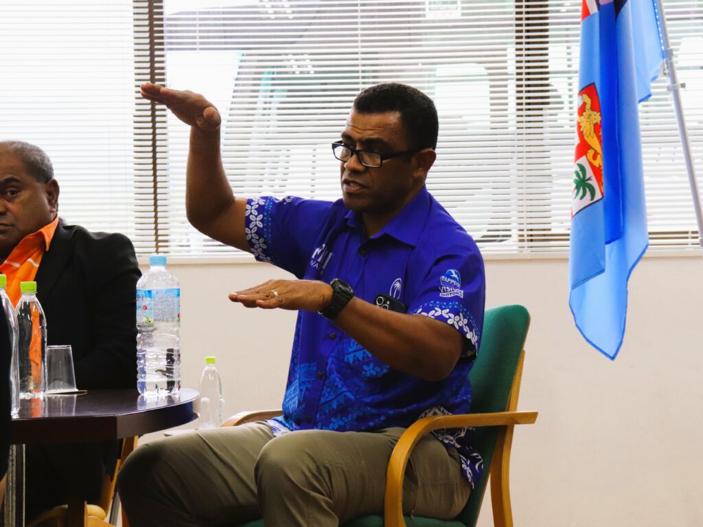 松本一朗副学長が本学の概要を説明。「現在本学は100を越える大学と教育提携を結んでいます。今、フィジーには提携校がありません。今後提携を結んで、学生の活躍やフィジーのスポーツ発展などに協力できたらうれしいです」とあいさつしました。ジェセ・サウクル青年スポーツ大臣は「フィジーの若者の才能を発掘し、開花させる教育とトレーニングをするために、今後、国立スポーツセンターの設立を目指しています。今回の視察で日本のノウハウを学びたい。フィジーでは、スポーツがビジネスや経済の発展に役立っています。日本経済大学にも協力してもらいたい」と話しました。