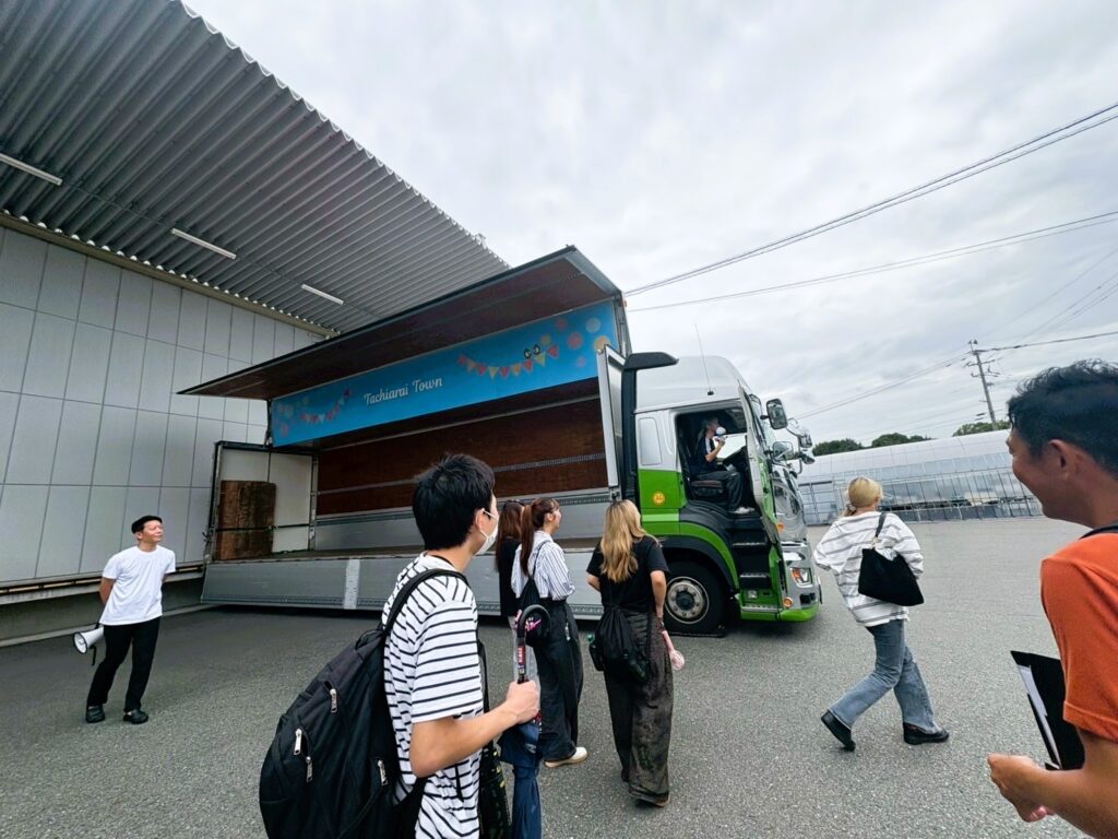 交流実習は、大刀洗町・株式会社ツルク・本学による産官学連携「障がい者アートを活用したラッピングトラック事業」の一環として行われました。大刀洗町役場・同町内の福祉施設・企業との連携を通じて、障がい者アートを活用した地域貢献を学ぶことを目的としています。大刀洗町役場福祉課の綿貫比呂美係長などから障がい者福祉の現状について説明を受け、大刀洗町地域おこし研究員の山田貴裕さんが進行し、地域課題を出し合って解決法を考えるワークショップをしました。町内にある福祉障がい施設を訪ね、ラッピングトラックのアートを作成した障がい者の方々と交流を深め、ラッピングトラックを実施する株式会社ツルクを訪問。ラッピングされるトラックの見学をしました。