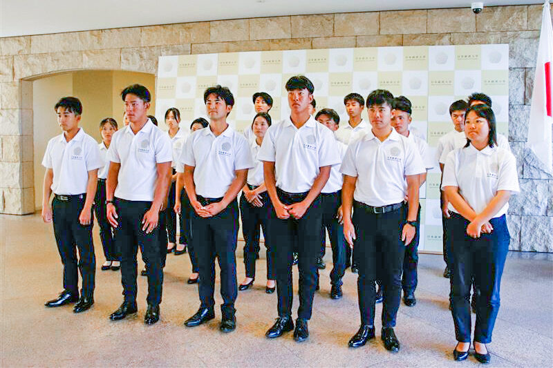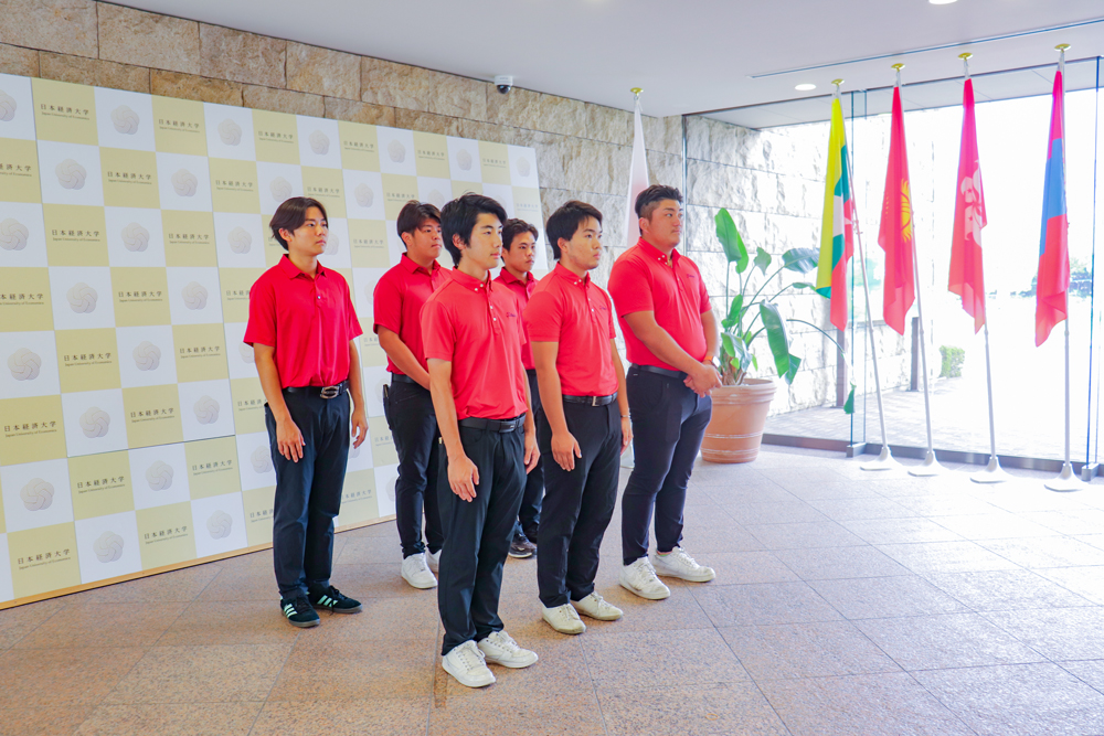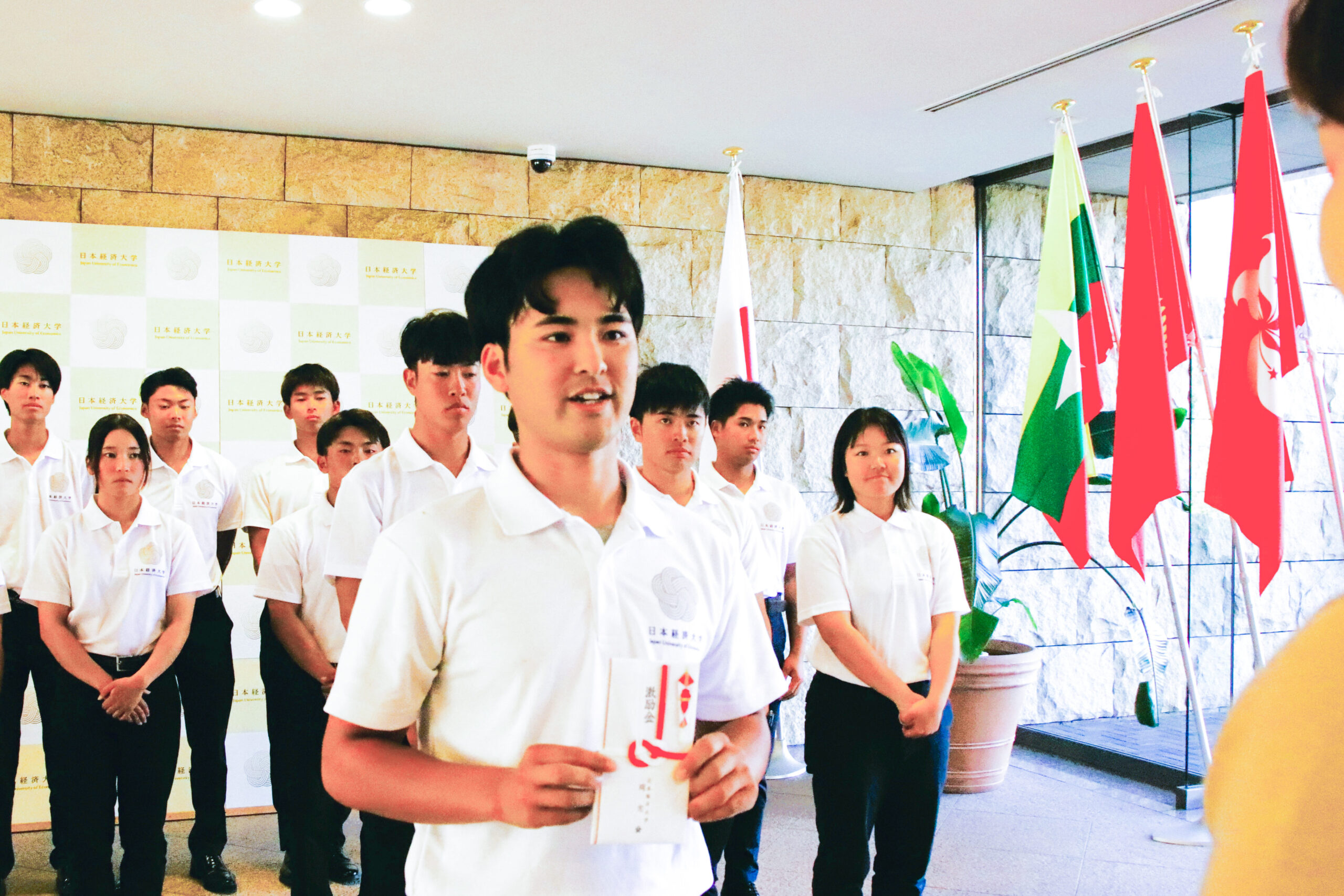 授与に先立ち、同窓会役員から「各競技ともに、日本経済大学の看板を背負っていることを1人1人忘れず、怪我のないように、部全員で力を合わせて、日本中に日本経済大学の名前を届けてください。体調管理に気を付け、好成績を残せるように頑張ってください」とエールが送られました。