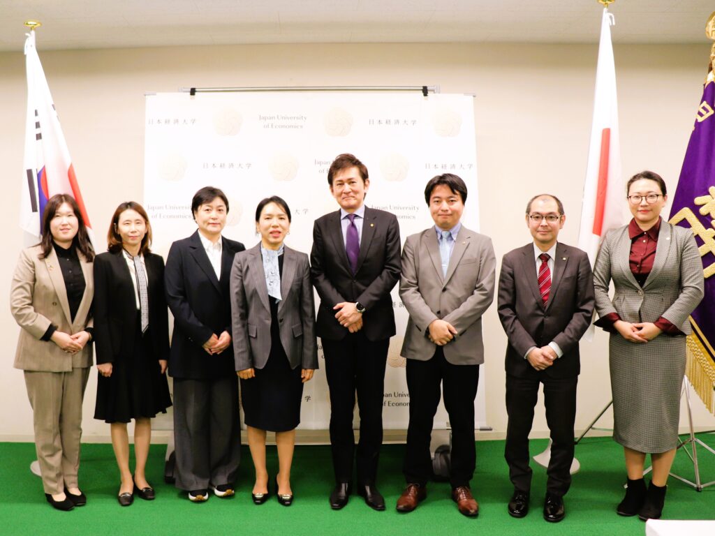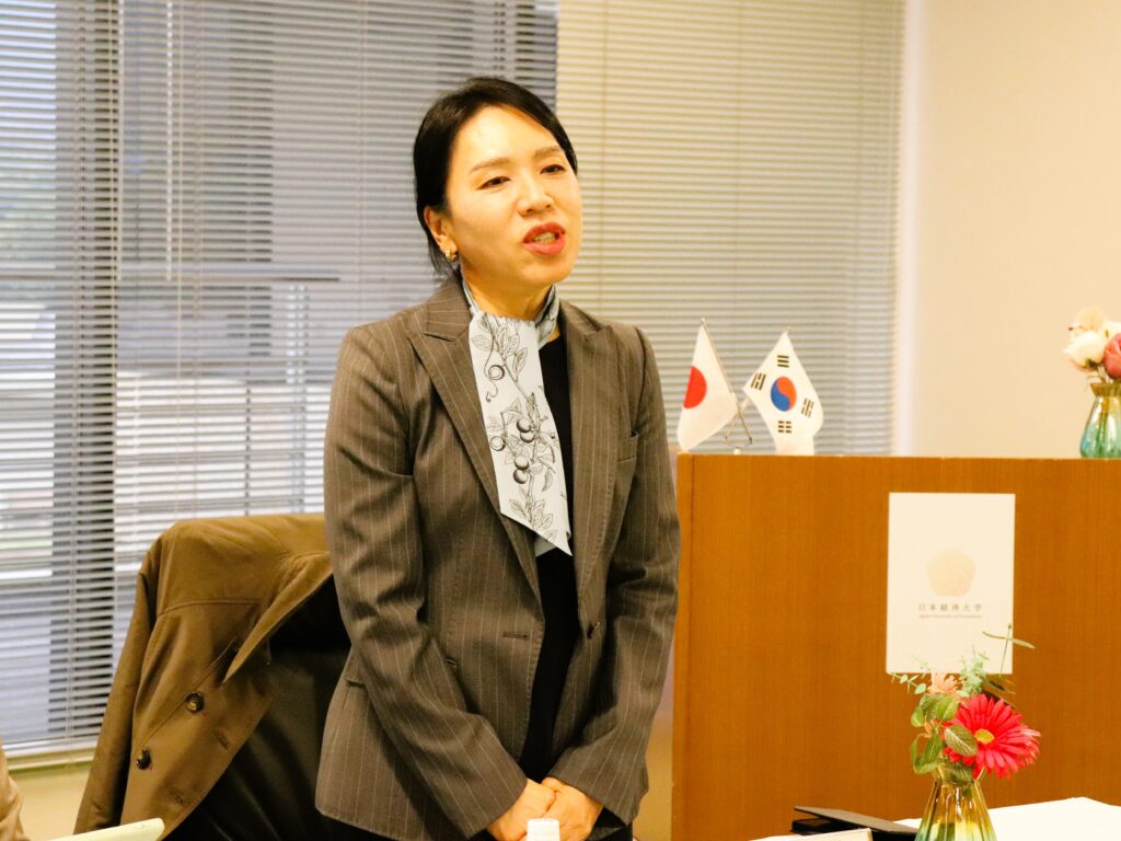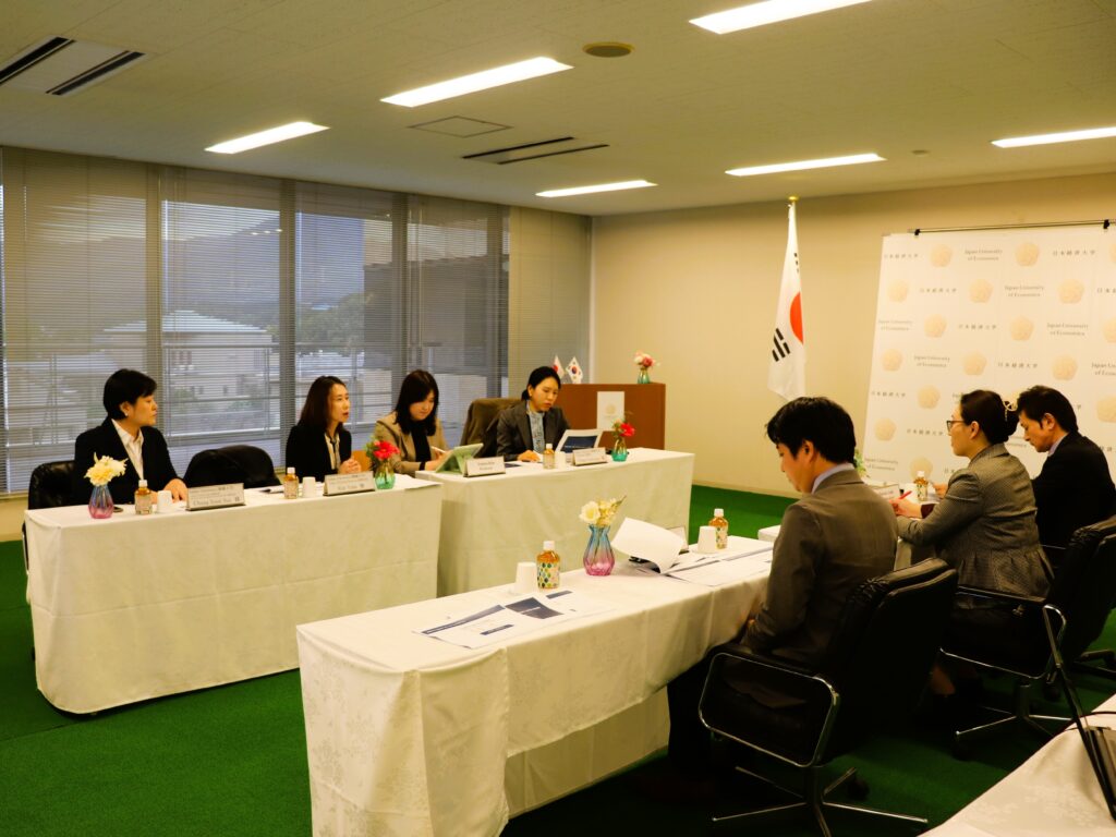 出迎えた安藤大祐副学長が「今日はようこそお越しくださいました。双方にとって良好な関係を築けるような、よいお話ができれば幸いです」と歓迎。チャン・ユンヨン総長が「大学に伺うのは3回目になりますが、いつも温かくお迎えくださって感謝しています。日本経済大学との交流をさらに活性化させていきたいと思います」とあいさつしました。