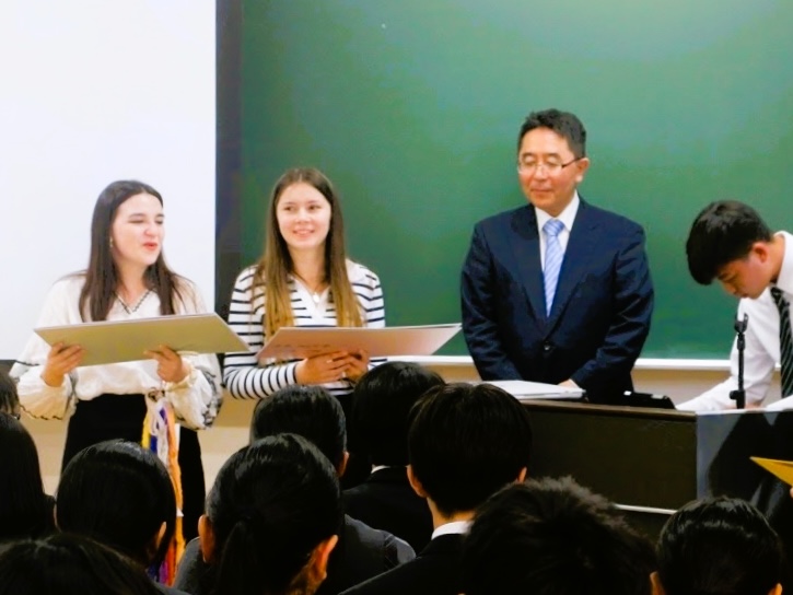 高森みどり中学校・高森高校の生徒さんの前でウクライナについてお話しする機会をいただいたとき、私は喜んでお引き受けしました。登壇の際は少し緊張していましたが、生徒のみなさんが大きな関心を寄せ、真剣に耳を傾けてくださったことは、これ以上ない喜びでした。遠い国の文化であるにもかかわらず、たくさんの質問をいただき、私も精一杯の日本語で、少しでもウクライナの文化を伝えようと一生懸命お答えしました。また、給食を一緒にいただきながら、フレンドリーな雰囲気で交流できたことも、心に残る良い思い出です。このようにウクライナ文化を語る素晴らしい機会をいただき、心から感謝申し上げます。