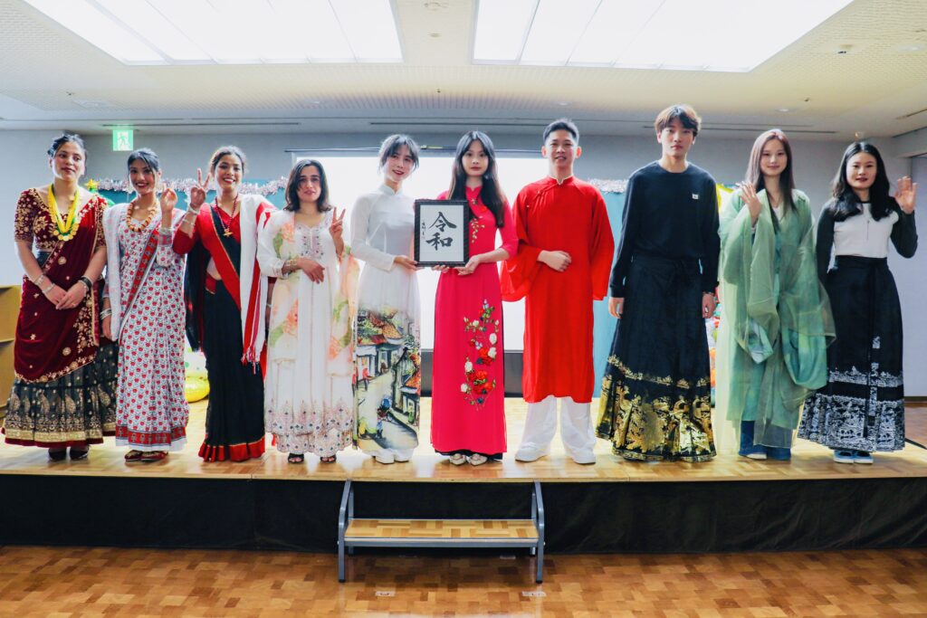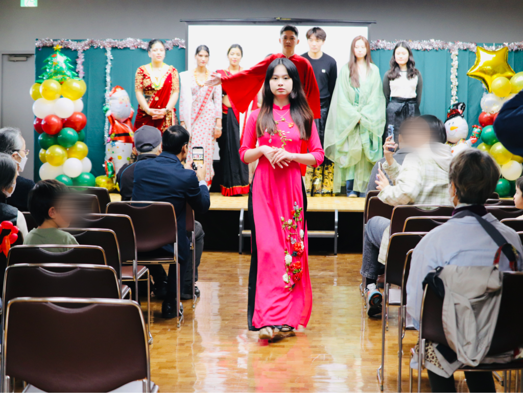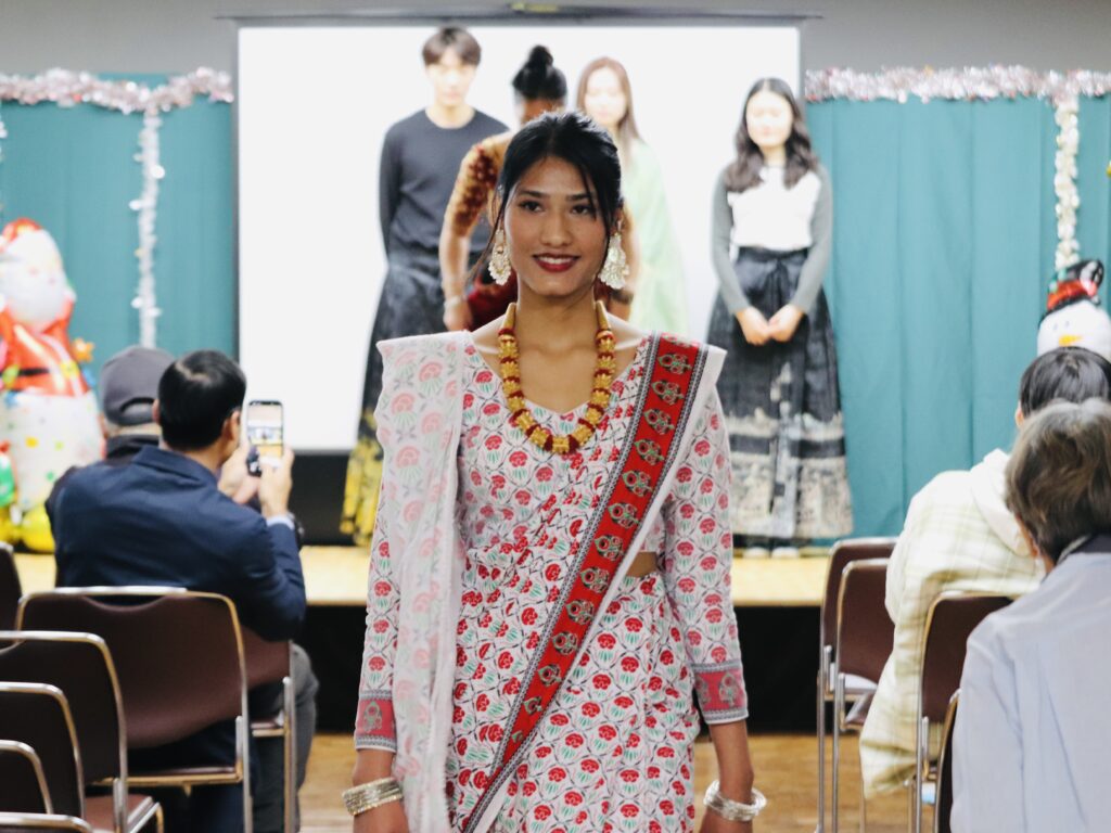 留学生によるファッションショーでは、竹川克幸地域連携センター長の司会進行のもと、中国、ネパール、ベトナム3か国の民族衣装に身を包んだ学生たちが登場しステージを彩りました。