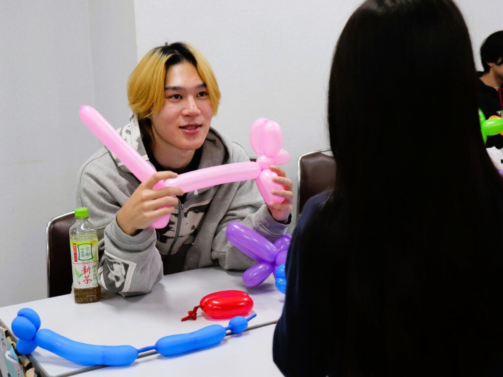 本学からは留学生によるタイカレーのブースのほか、商学科が合同でバルーンアート、ビーズブレスレット作りの体験ができるコーナーを設置しました。多くの方に立ち寄っていただき、どのブースも賑わいを見せていました。バルーンアートには土に還るラテックス素材を使用した風船を使用し、素材の特徴について参加者の皆さんに紹介しました。