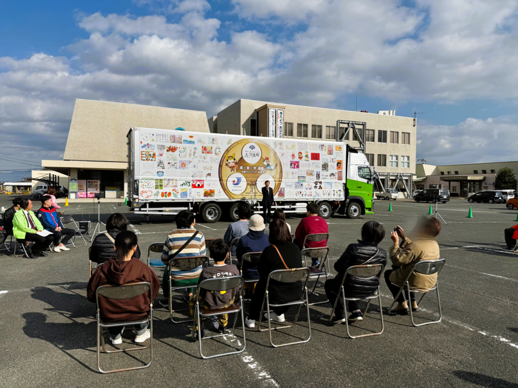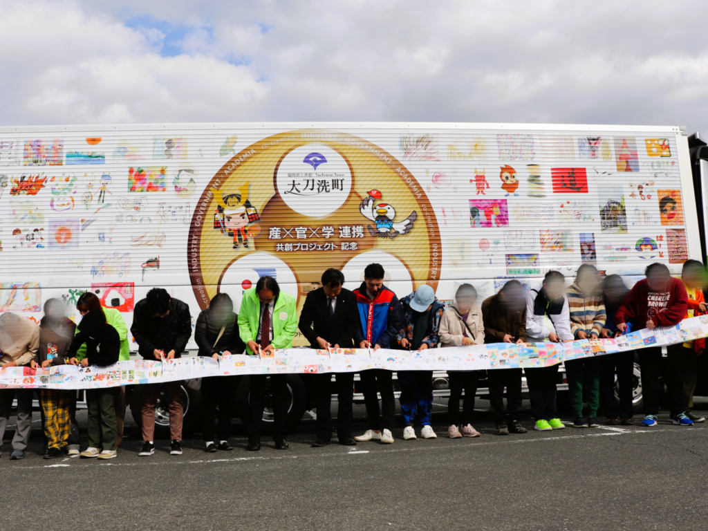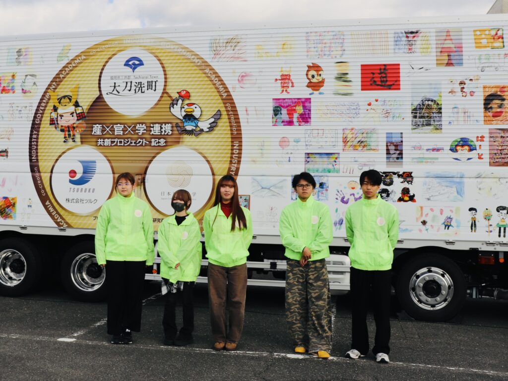 12月7日、福岡県の大刀洗町役場で、商学科1年生対象の「SD合同ゼミ・地域貢献Ⅰ」授業での地域貢献活動、大学×地域・行政×企業の産官学連携・地域連携による共創プロジェクトの成果として、福岡県大刀洗町、株式会社ツルクと合同でラッピングトラックのお披露目式が行われました。