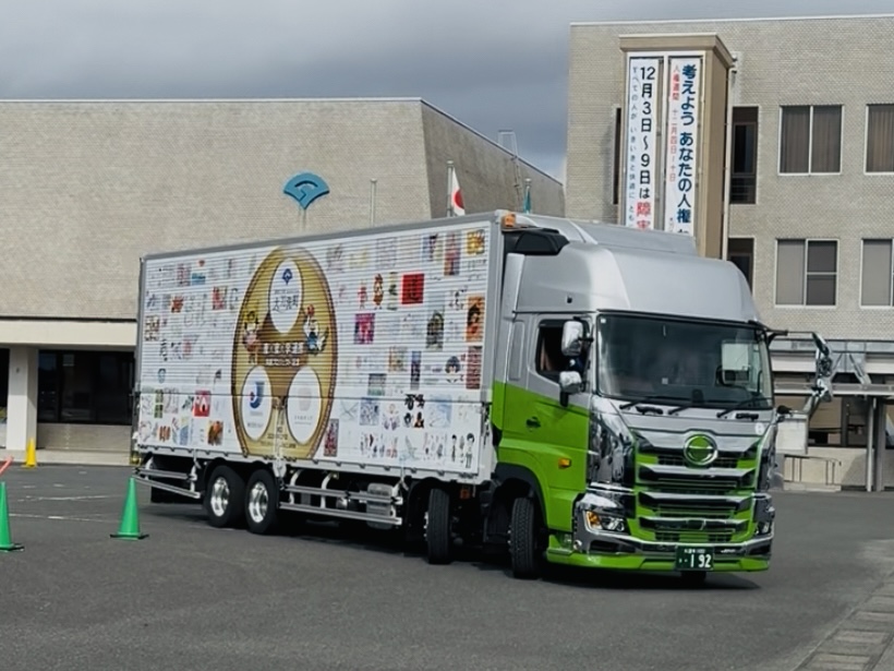 商学科1年生対象の「※SD合同ゼミ・地域貢献Ⅰ」は2025年6月から、大刀洗町福祉課や町内の福祉施設、大刀洗町パートナー企業の株式会社ツルクと産官学連携し、障がい者アート(インクルーシブアート)を活用した地域貢献活動に取り組みました。今回、成果として、大学×地域・行政×企業が共創するラッピングトラックが完成しました。トラックのラッピングデザインは、大刀洗町内にある福祉施設の方が描いたアート作品を採用し、本学の学生がレイアウトを考案。プロジェクト関係者らがデザイン構成を整え、株式会社ツルクがトラックへ施工・実装を担いました。トラックは、大刀洗町の皆さんの想い、夢や希望を乗せて九州一円を走ります。