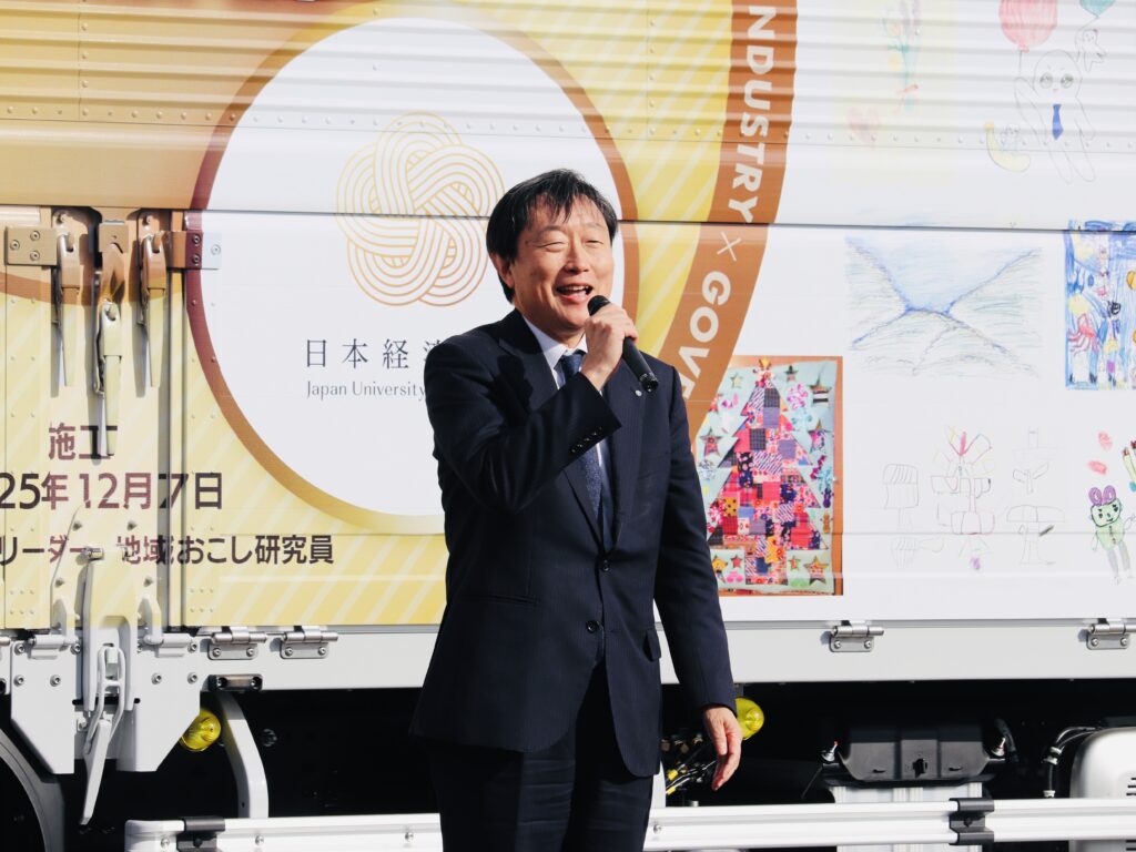 企業と行政、大学が一緒になって進めてきた成果を、皆様にお届けすることができ、大変感動してます。地域を走り回るトラックは、関わったすべての皆様の思いを運び、つなぎ、産官学が協力して力を合わせればこういうことが実現するというメッセージを、各地に届たいと思っております。