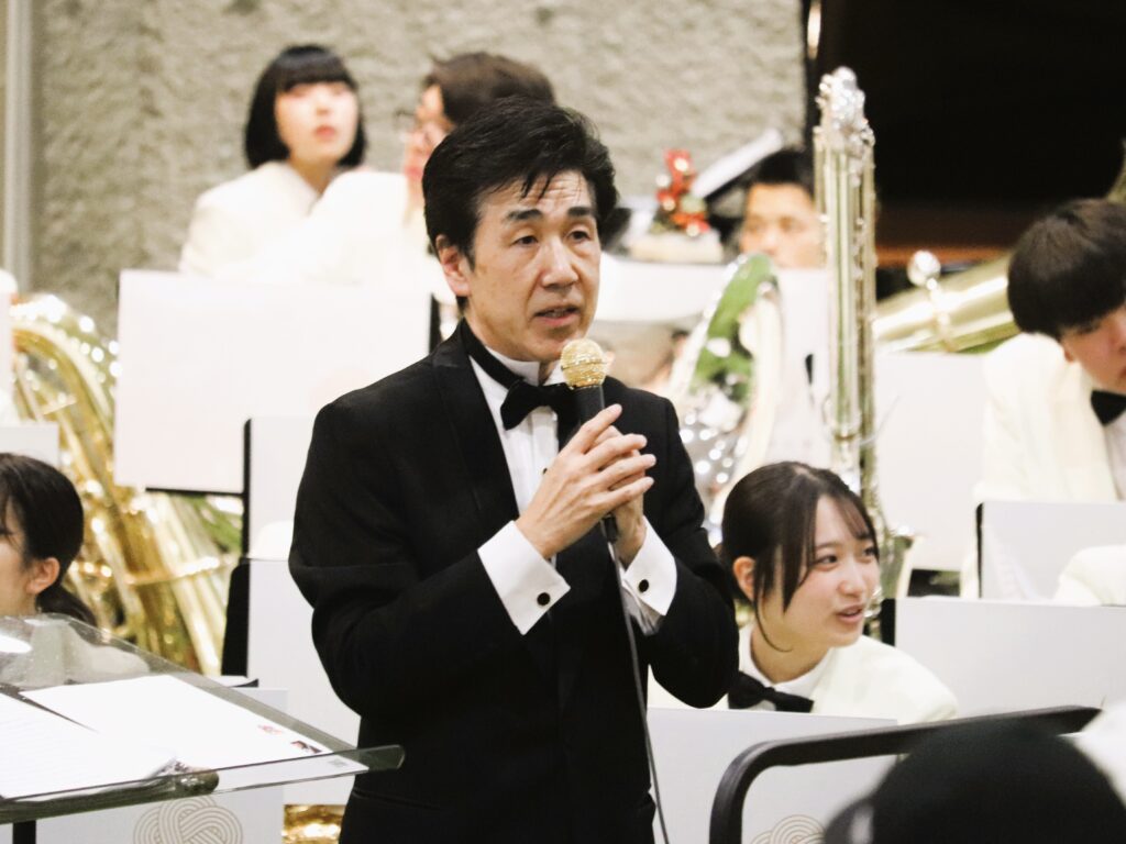 本学吹奏楽部部長兼常任指揮者 柴田裕二教授(経営学部 芸創プロデュース学科長)が「お世話になっている地域の皆様に全国大会初の金賞受賞をご報告できること、大変嬉しく思います。今日は楽しんでいかれてください」とあいさつしました。