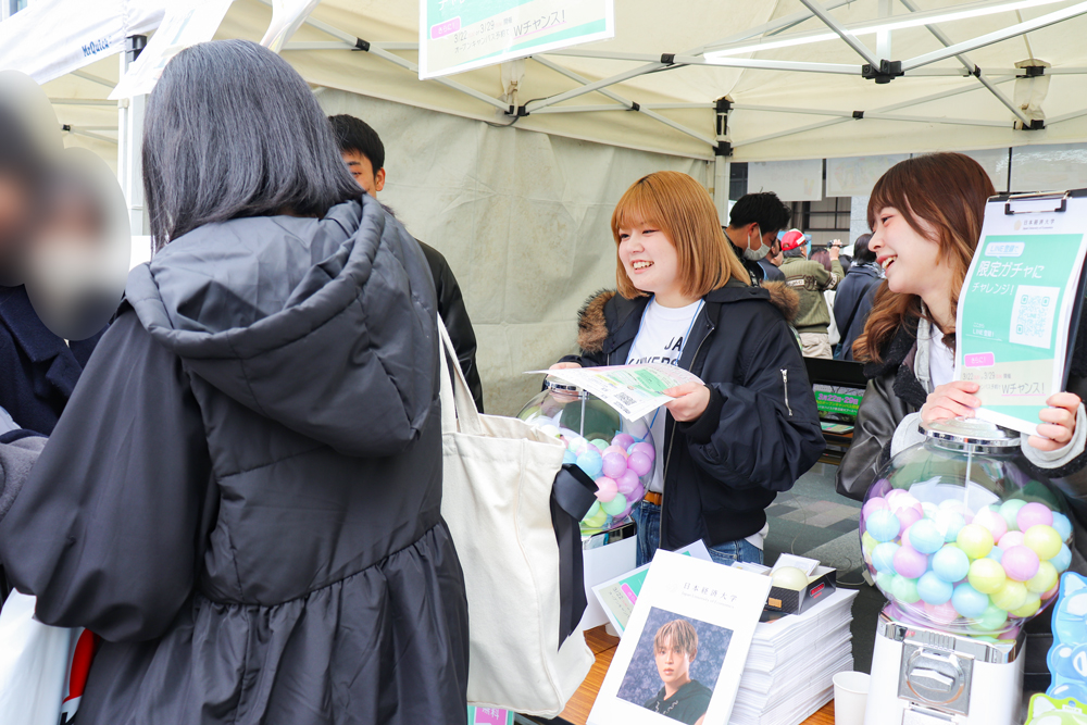 オープンキャンパスでも活躍している学生スタッフがイベントブースでのお客様対応を務め、LINE登録で抽選に挑戦できることやWチャンスなどについて丁寧に説明したり、豪華賞品が当たった際にはお客様と一緒に喜んだりしながらブースを盛り上げてくれました。