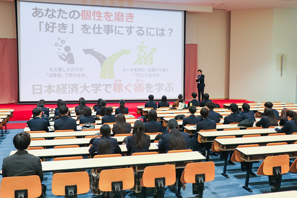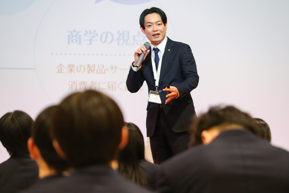 はじめに安藤大祐副学長が本学を代表して登壇し、建学の精神である「個性の伸展による人生練磨」について「偏差値という指標にとらわれず、専門性や個性を伸ばし、それを武器に好きなことを仕事にしていくことを本学は目指しています」と紹介。その後、本学の学びの中心である経済学・経営学について、円安や衆議院議員選挙といったトピックに触れながら、「社会に出たとき、自分の判断でお金の運用や投資などができるよう、大学の4年間で経済やお金の仕組みをしっかり学んでほしいという思いが本学の教育には詰まっています。この経済学と経営学の2つは、夢を実現させるための大きな柱です」と説明しました。