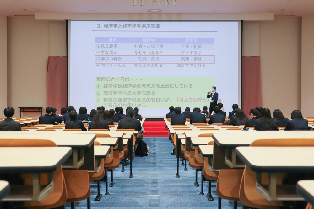 経営学科 塩﨑裕務准教授による模擬講義では、経済学・経営学の考え方について、買い物や学校生活などの身近な話題を例に挙げながら解説しました。