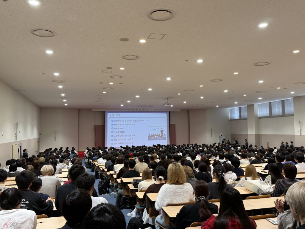 当日は、大学生活のスタートにあたって必要となる基本的な情報、履修登録の進め方や学内サービスの利用方法、学生生活を送るうえでの留意点などについて説明しました。