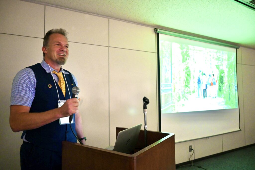 9月30日に開催された「令和7年度 自然共生サイト認定式」では、本学で生物学・環境科学を担当し、ガーデンでの生物多様性調査や管理にも携わるデジレロイ・バルテレミ講師が登壇。ガーデンに生息する希少種や、ガーデンを活用した教育活動についてプレゼンテーションを行いました。