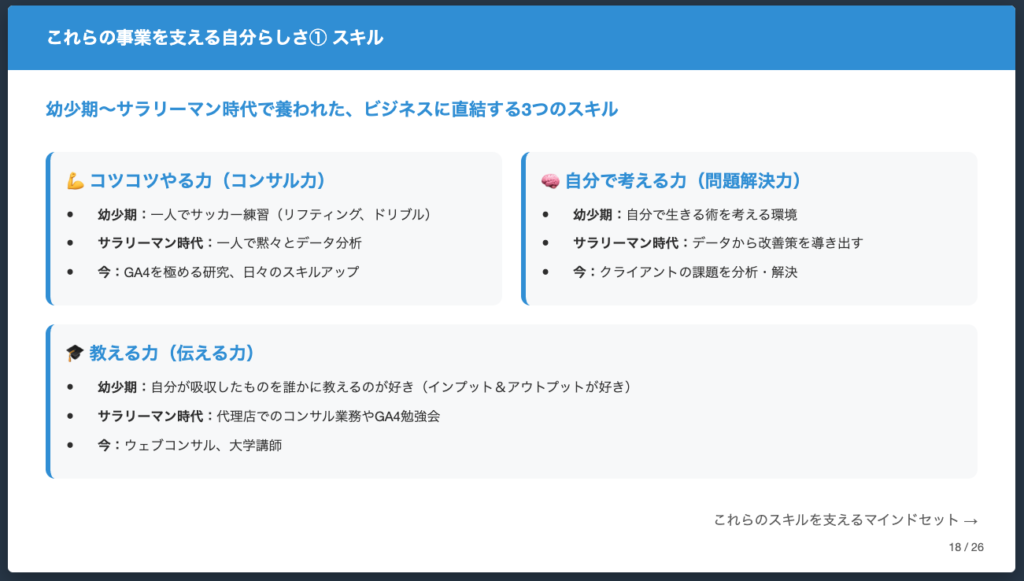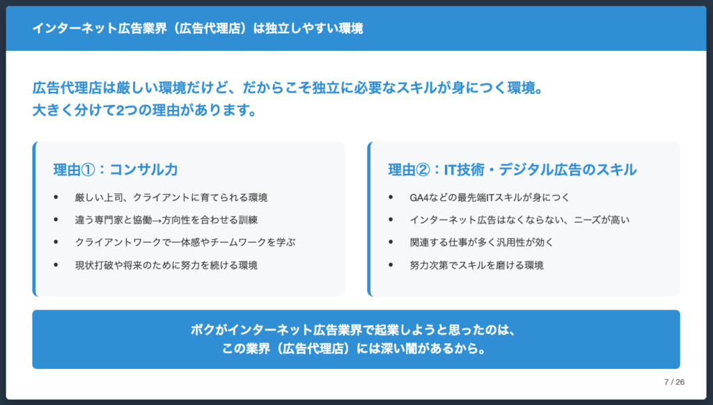 馬場先生によると、インターネット広告のような代理業は、扱う商材の影響を受けやすいため差別化が難しいと言われています。しかし、競争が激しい業界だからこそ、自分の強みを明確にすることが重要であり、それが起業に必要なスキルの習得にもつながるとのことです。特に、①課題を明確にし、チームで解決に向けて行動する「コンサルティング力」、②近年ますます重要となっているIT・デジタル領域のスキルが不可欠であると強調されました。
