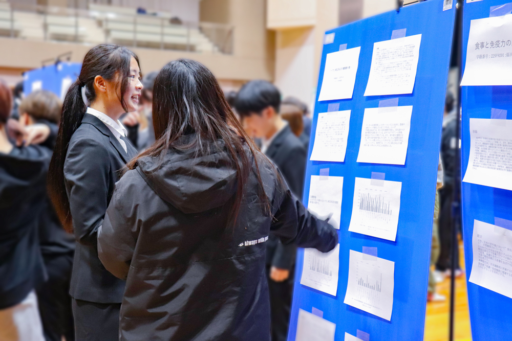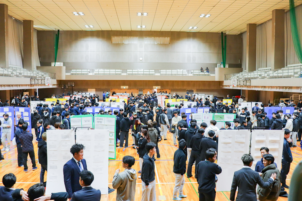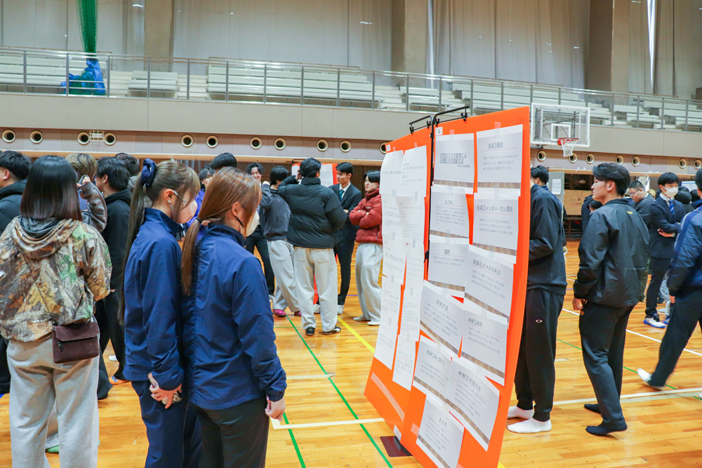 今年は各学年合わせて約700人の学生が会場に集まり、そのうち4年生120人が、8つの専門ゼミごとに発表を行いました。自身の研究内容をポスター形式で掲示し、下級生に向けて持ち時間内で説明しました。1〜3年生は先輩たちの説明に耳を傾けたり、気になるポスターをスマートフォンで撮影するなど、理解を深めていました。
