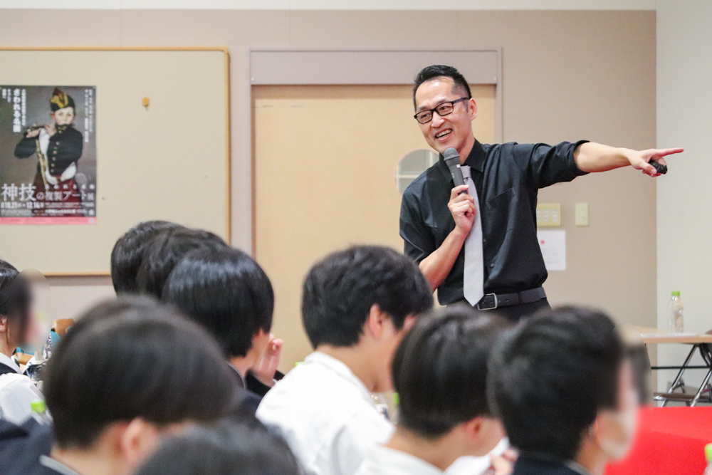 冒頭、芸創プロデュース学科の河野督講師が大学の紹介を行いました。