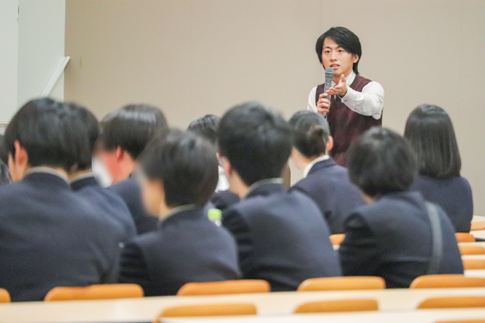 本学の学びのベースとなる「経済学」と「経営学」の違いから始まり、各学科・コースの特徴に触れ、多くの実務家教員が活躍していることなど本学の特徴を解説しました。