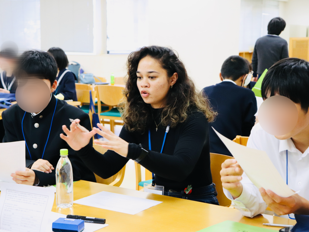 留学生との交流では、グループに分かれて自己紹介をしました。手製の福笑いを作って持参したグループもあり、留学生と一緒に楽しんでいました。その後、英語を使ったビンゴゲームに挑戦。生徒たちは英語でのルール説明に苦戦しながら、表現を工夫して積極的に会話をしました。