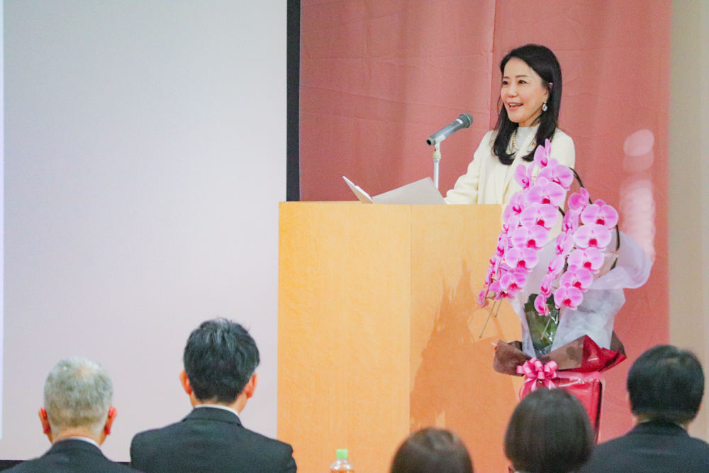 冒頭、本協議会の主催者である都築明寿香学長が登壇し、「皆様方に支えられ、今年で開催10回目を迎えることができました。本学が高大連携に力を注ぐ理由は明確です。小中高等学校、特別支援学校の現場で何が起きているのか、何が求められているのか、その教育現場のリアルな声に真摯に耳を傾け、大学教育、教職課程、さらにはキャリア教育全体へと反映させることこそが、教育改革の出発点であると考えているからです。本日は本学と連携事業を行われた各高等学校及び地域の教育機関からの実践発表を楽しみにしております。毎年、貴重な資料や情報をご提供いただき、本協議会の規模、質ともに年々高まっていることは、ひとえに皆様のご尽力の賜物であり、心より感謝申し上げます」と挨拶しました。