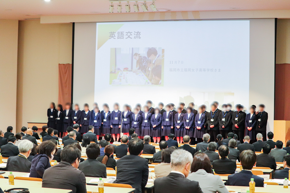 協議会では、小中学生英語スピーチコンテストでボランティアを行った高校生に、参加したきっかけや感想についてのインタビューが行われました。また同日、英語研修に参加していた福岡県立福岡中央高等学校の生徒たちが見学に訪れ、壇上で挨拶をするなど、高校生の積極的な参加が見られました。