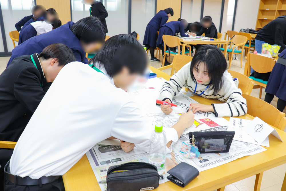 その後、グループごとに留学生と交流を行い、母国の文化や食べ物などについて英語でインタビューをしました。その中から発表のテーマを決定し、留学生と協力し合いながら内容を模造紙1枚にまとめ、ポスターを作り上げました。