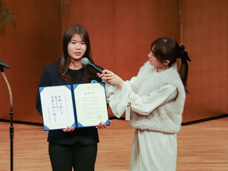 2月8日、太宰府市のプラム・カルコア太宰府(太宰府市中央公民館)で太宰府市主催「世界に羽ばたく人材育成表彰」授賞式が行われ、本学学生が表彰されました。