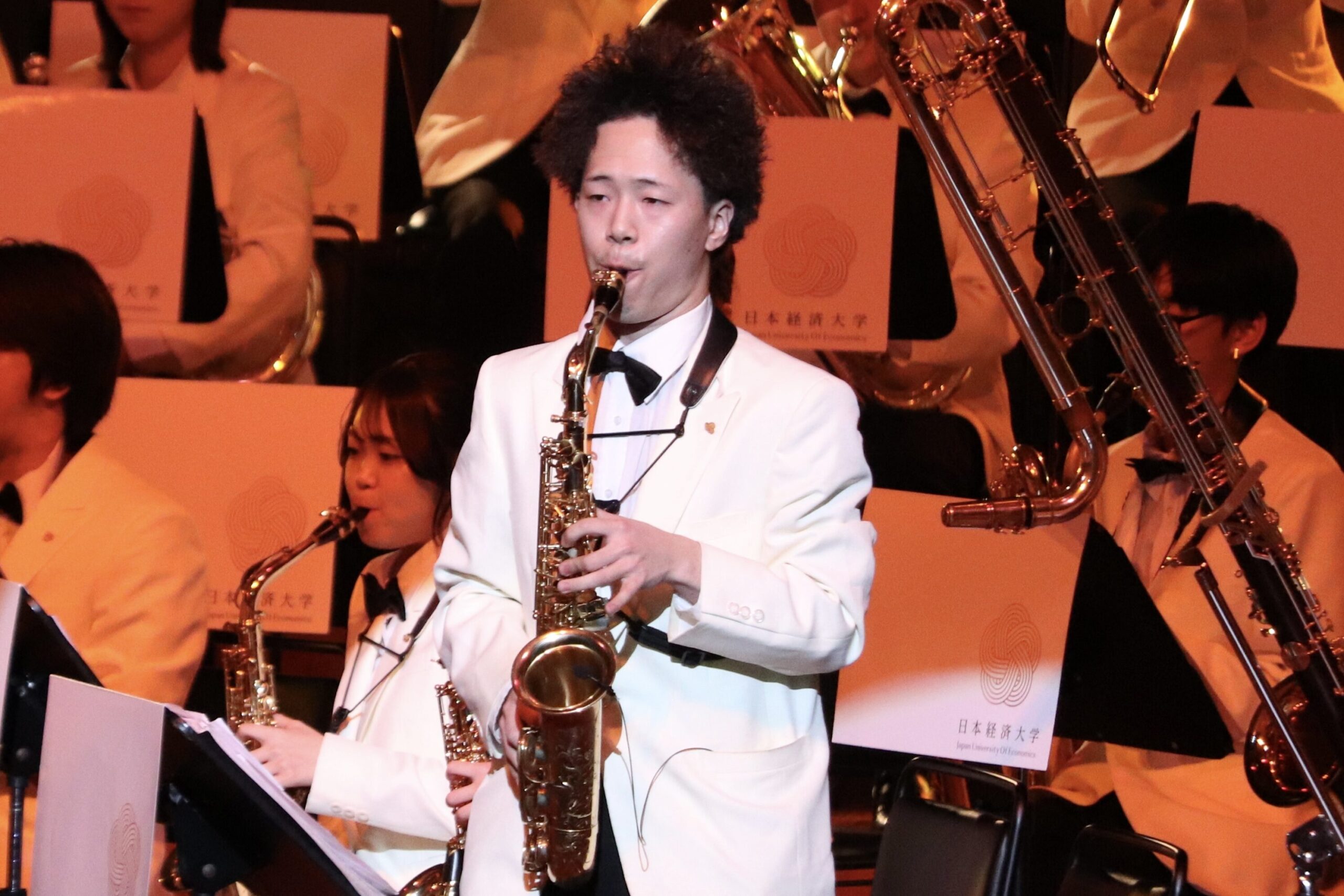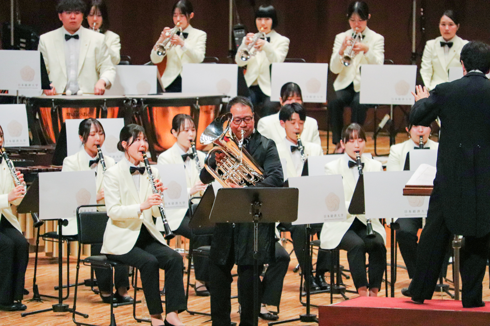 演奏会のスペシャルゲストとして、ユーフォニアムの日本のトッププレーヤー 外囿祥一郎さんが出演しました。ユーフォニアム特有の温かく柔らかな音色が会場全体を包み込み、卓越した技巧と豊かな表現力が聴衆を魅了しました。また、外囿さんは吹奏楽部と一緒に演奏もしました。