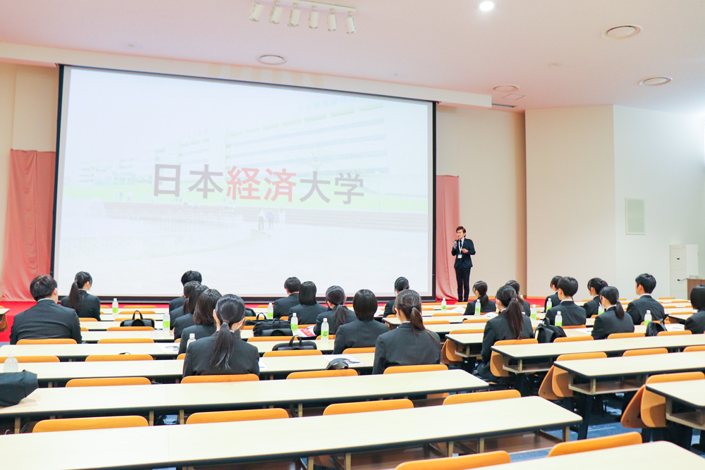 安藤副学長は本学の学びの中心である経済学を学ぶ意義や本学の教育方針について紹介したほか、大学と専門学校の違いについても説明しました。