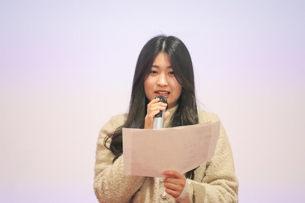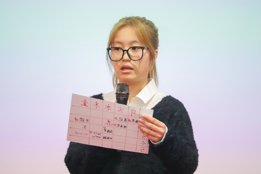その後、在学生の菅原京子さん(経済学科1年)と坂木杏珠さん(商学科1年)が登壇し、1週間の時間割をもとに自身のキャンパスライフについて紹介しました。