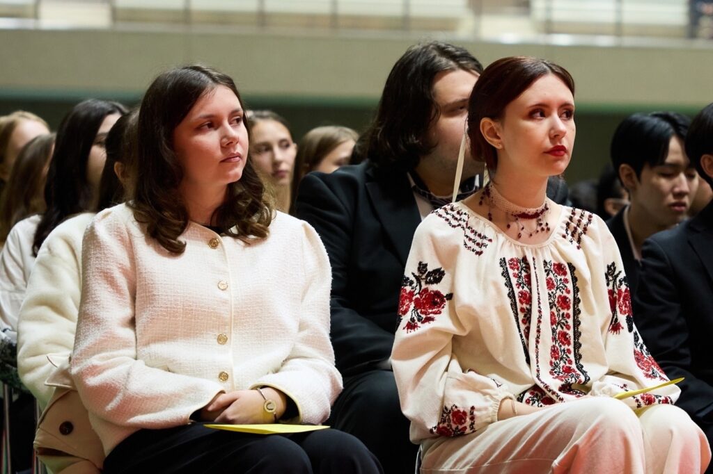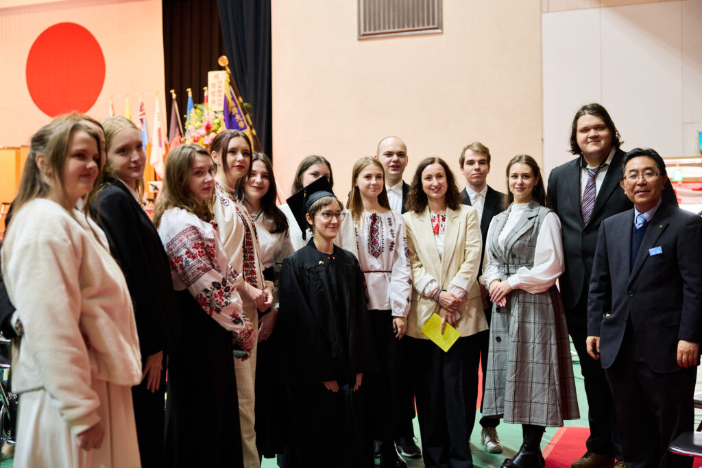 「ウクライナ卒業生の皆さん、皆さんの存在がウクライナの未来であり、皆さんの成長がウクライナの希望です。4月からは、新社会人としての新たな生活が始まります。キャリアを積み重ねる場所がどこであろうと、皆さんは常にウクライナの尊い代表であり、ウクライナと日本の架け橋です。皆様のご健康とさらなるご飛躍、そして平和な未来を心よりお祈り申し上げます」と語りかけました。
