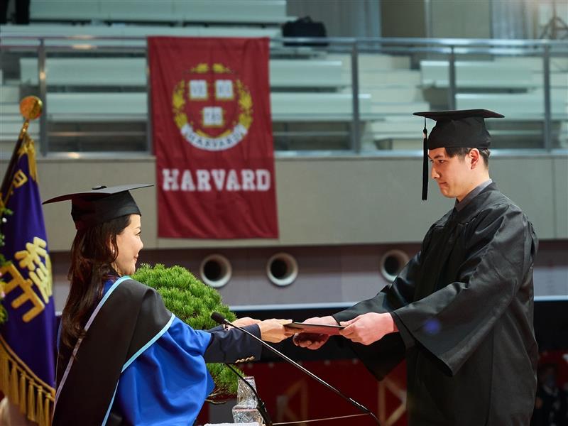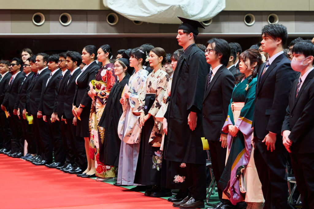 学生を代表し、第77回全日本大学バスケットボール選手権大会で3位という輝かしい成績を収めた男子バスケットボール部において、チームの中心として活躍したプライス叙珠亜さん(健康スポーツ経営学科)が、学位記を受け取りました。