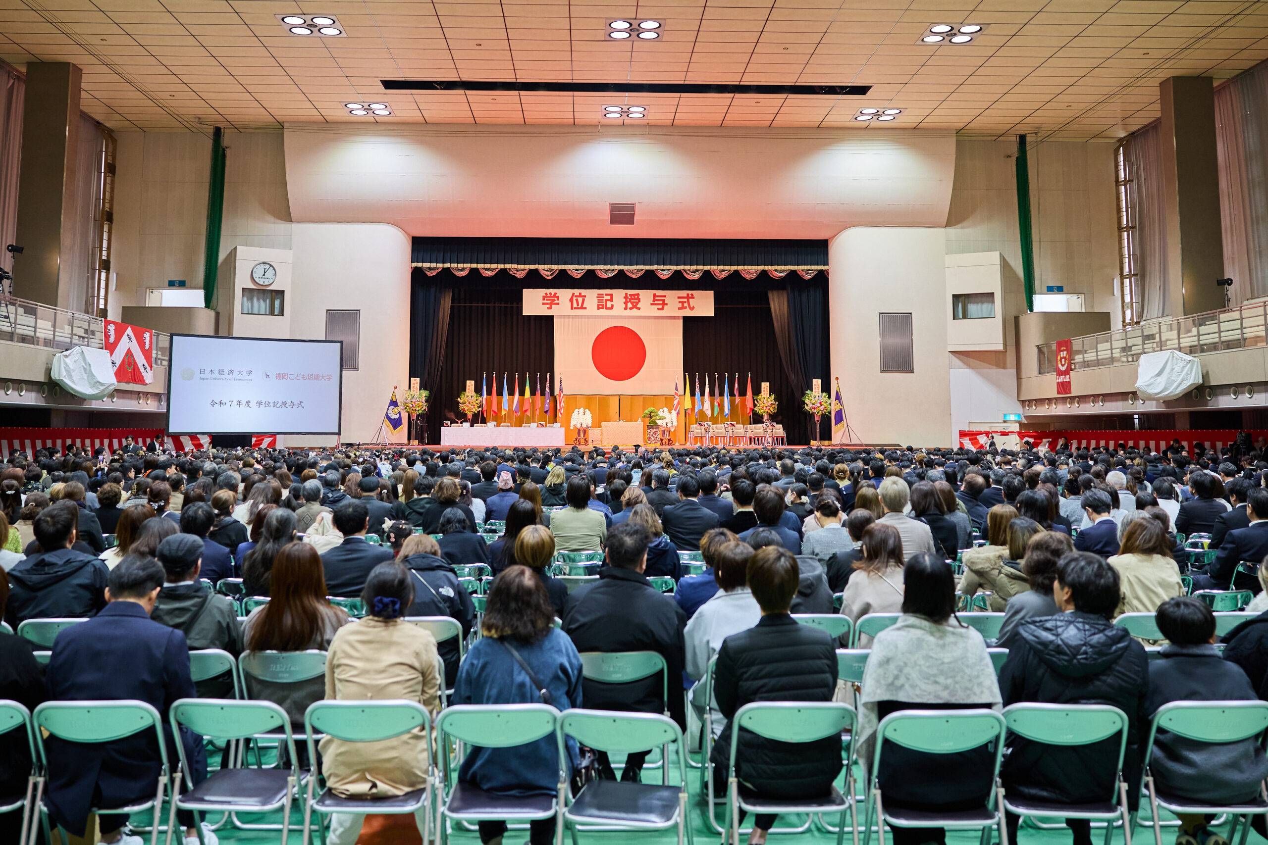 式は本学 福岡キャンパスと神戸三宮キャンパス、グループ校の福岡こども短期大学の合同で行われ、835人の学生が参列しました。