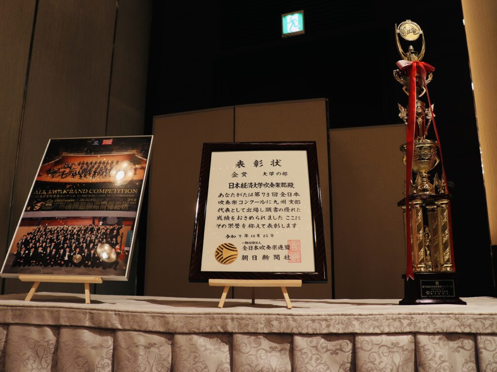 2018年11月に着任し、学長先生のご支援のもと楽器を揃えていただき、2019年4月にわずか16名で創部いたしました。コロナ禍で約1年半の活動停止という試練も乗り越え、創部4年目に全国大会へ初出場、そして4回目の出場でついに金賞を獲得することができました。当初10年かかると思っていた夢が、7年で実現できましたのも、学長先生をはじめ、高校の先生方、教授の皆様、そして何より挑戦し続けた学生たちのおかげでございます。この金賞はゴールではなく、次なる挑戦へのスタートと捉え、これからも精進してまいります。