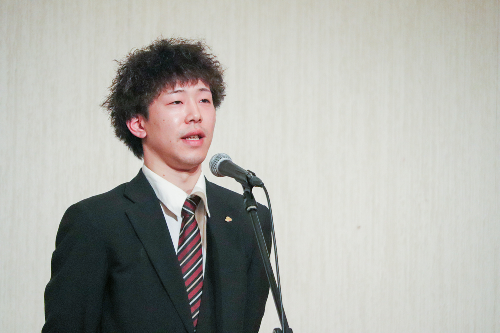 私たちはこれまで、コンクールに向けた練習はもちろん、1つ1つの本番を大切にしながら取り組んできました。本番で見つかった課題や改善点を次の演奏に活かすことを繰り返し、この金賞につながりました。この度はこのような祝賀会を催していただき、学長先生をはじめ、関係者の皆様に感謝いたします。