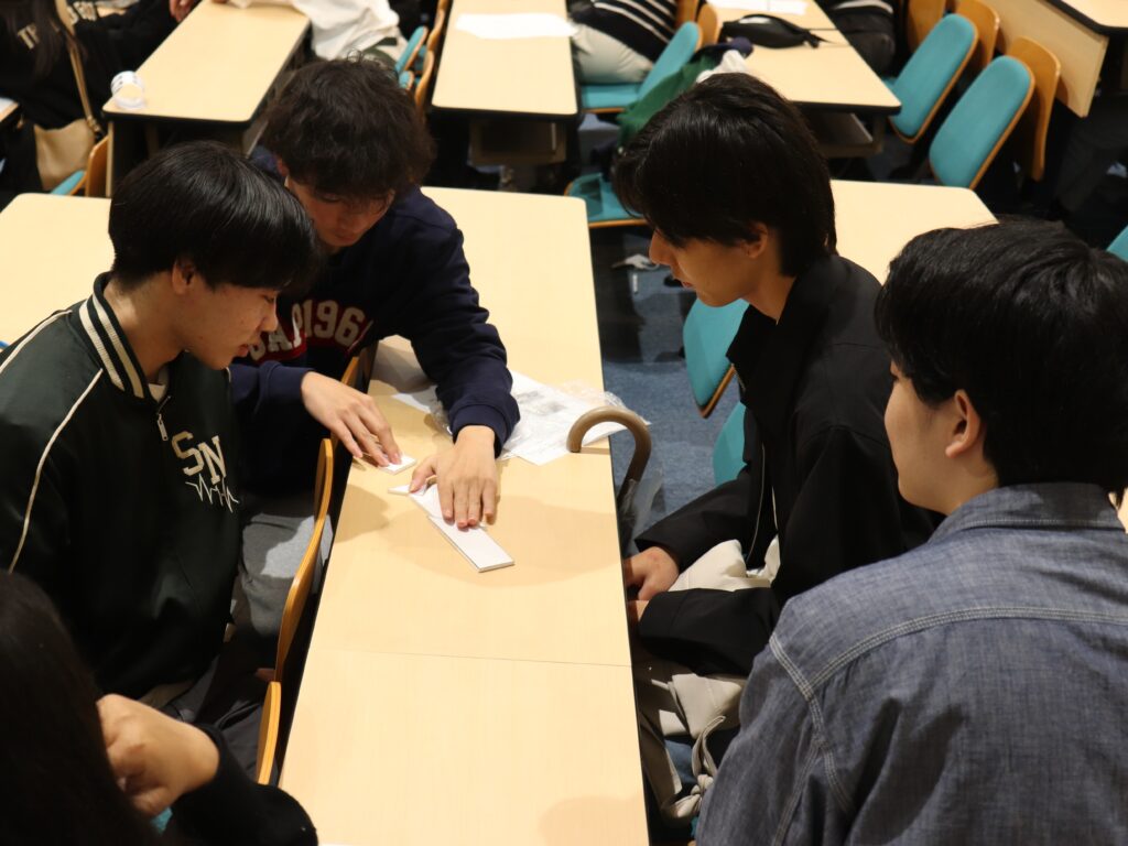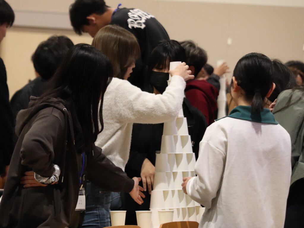 チームごとに自己紹介とチーム名を決め、名前や趣味、不安や聞いてみたいことを共有しました。その後、紙コップタワー作りに挑戦し、工夫を凝らしながら最も高いタワーを目指して協力する姿が見られました。