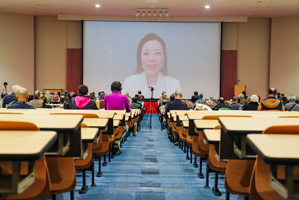 続いて、本学の都築明寿香学長によるメッセージビデオが再生され、その中で都築学長は「本学は悠久の歴史と文化を育む太宰府の地に1968年に開学いたしました。 東アジアの交流拠点であった大宰府の歴史にも関連する史跡・鴻臚館にちなんで名付けられたこのKOROKAN大講義室において、大宰府アカデミー学長の佐藤信先生、副学長の赤司善彦先生をお迎えし、大宰府史跡と考古学についてご講演いただけますことを大変楽しみにしております」と挨拶しました。