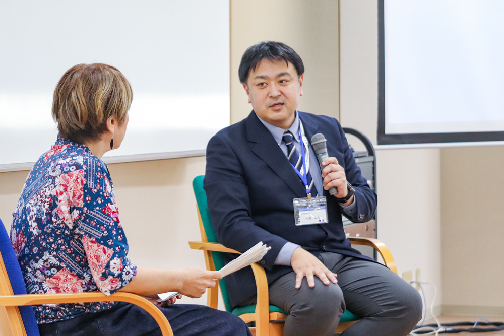冒頭には、本学健康スポーツ経営学科所属で、男子バスケットボール部監督の片桐章光准教授とジャーナリストの島田優子氏による特別対談「九州から日本一&選手の主体性-ダブルゴールに挑む-」が同学科の瀧豊樹教授の進行で行われました。