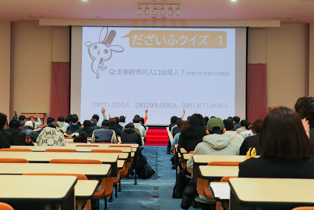 まず、大山氏が市役所での業務内容や太宰府市の取り組みについて、「だざいふクイズ」を交えながら紹介しました。
