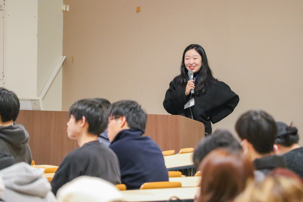 3日は「太宰府市国際・交流課のお仕事」をテーマに、国際・交流課の大山健太郎係長と本学商学科の卒業生でもあるキムシンヒョン氏が登壇しました。