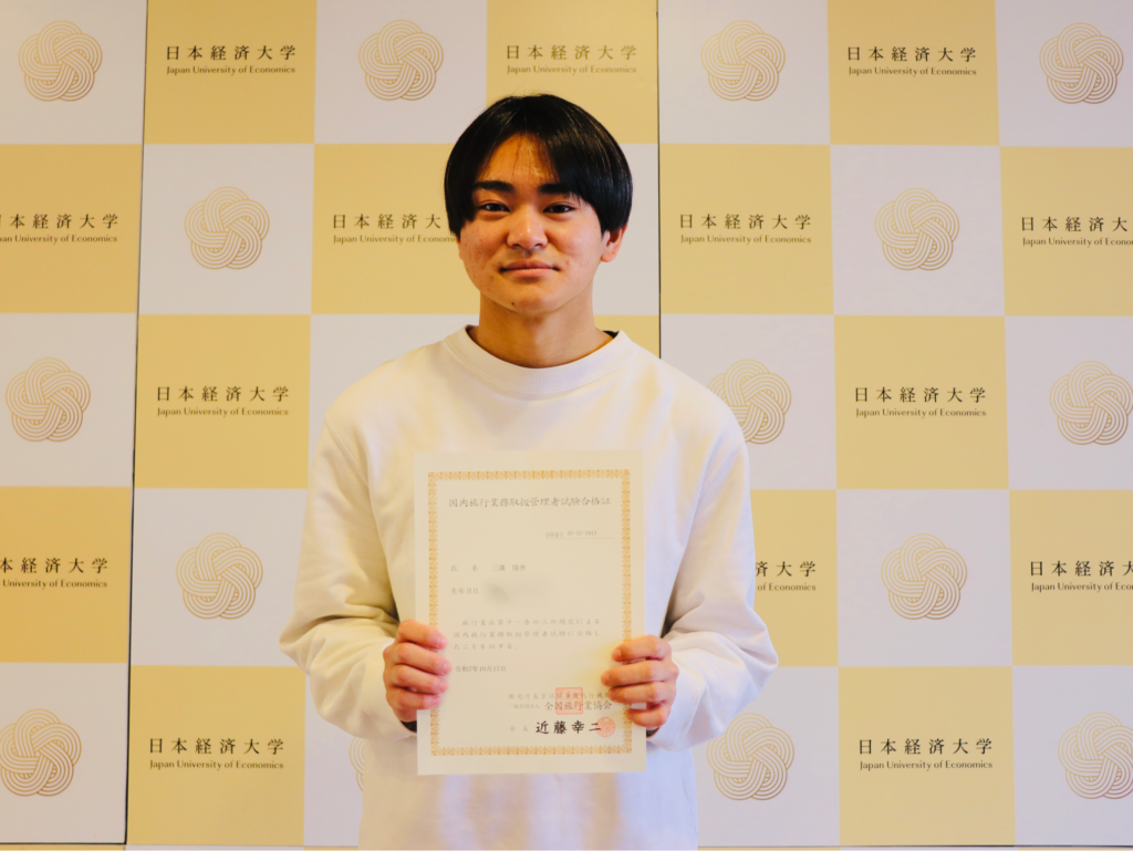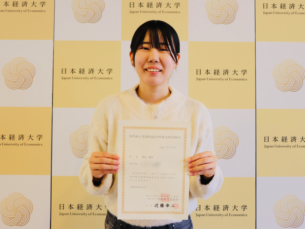 父が旅好きだったので、子どもの頃から、家族みんなで日本全国を旅行してました。その影響で、旅行代理店で働きたいと思うようになり、日本経済大学を選びました。代理店で仕事をするために、資格がある方が有利だと思っていたので、1,2年で対策講座を受けました。2年生の時は、不合格だったので、苦手な部分を中心に勉強し、今回合格することができました。資格があることで、就職活動でも自信を持ってできます。来年は国外の旅行を取り扱う総合旅行業務取扱管理者試験の合格を目指します。